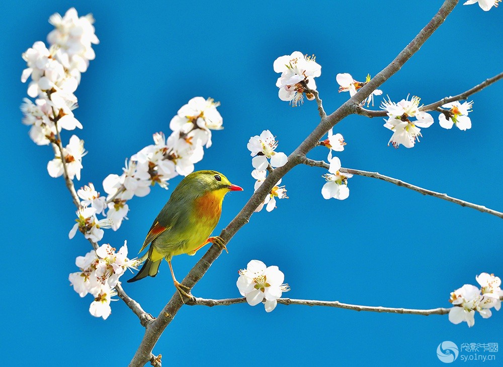 蓝天 白花 小绿鸟,很美的画面!漂亮抓拍! |