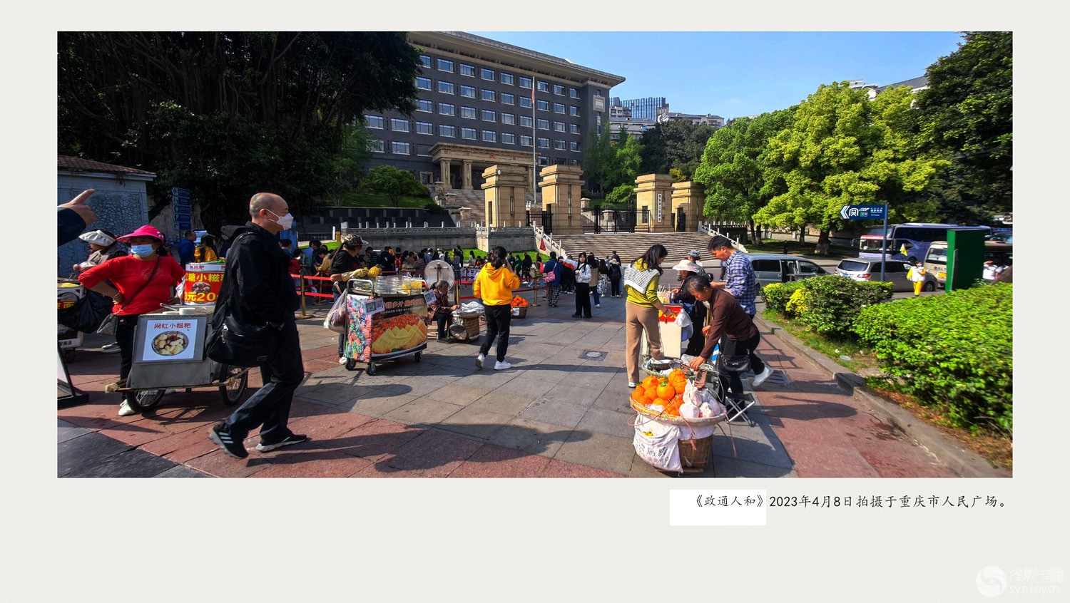 市政府与门前的小摊小贩和谐共处。